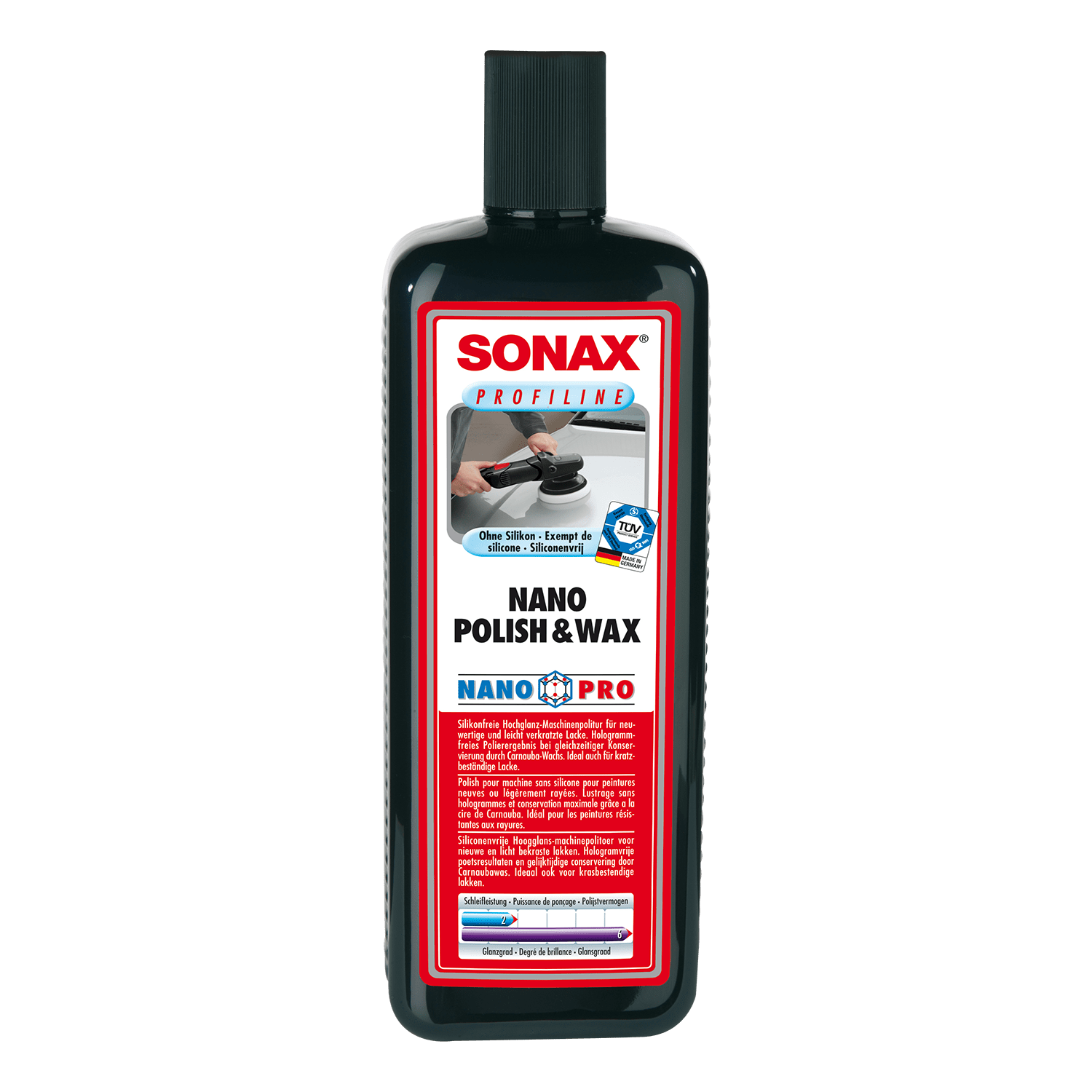 High gloss machine polish for nearly new and slightly scratched paintwork.Produces a hologram-free polishing result with simultaneous conservationthrough Carnauba wax. Very easy to apply. Also ideal for scratch resistantpaints. Mild to medium abrasive effect (cut). Silicone-free.